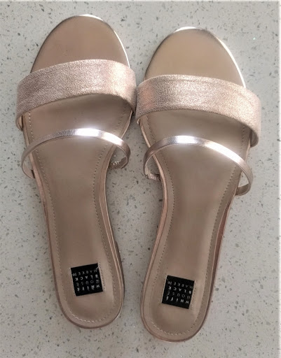 Finally, I needed to replace my falling-apart summer flipflops. I generally buy my shoes new, but I was willing to look at used first. These were not purchased at Goodwill; instead, I visited a consignment store nearby that holds very high standards for the shoes they'll accept for sale. With the help of a friend, I found these beautiful WHBM sandals that looked like they'd never been worn: